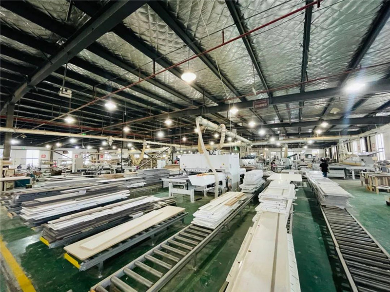 梅建华董事长表示:膜压饰面制品从风格打造、颜值呈现以及高性价比等方面能满足不同层次消费群体的需求,工厂应从产品工艺细节和品质方面做更多的改善和提升,让加盟商能够将更好的产品实现落地交付,让膜压饰面制品得到消费者的认可;同时也希望业界同仁能够在原材料上下功夫,基材的稳定性,面材的颜色、抗污性能、抗划伤性能等方面作出提升,给到全屋定制生产企业一些技术上的指导和帮助,共同提升膜压饰面制品在终端消费者心目中的认知。 随后在梅建华董事长及生产厂长、营销部人员的带领下,一起走进了生产车间。