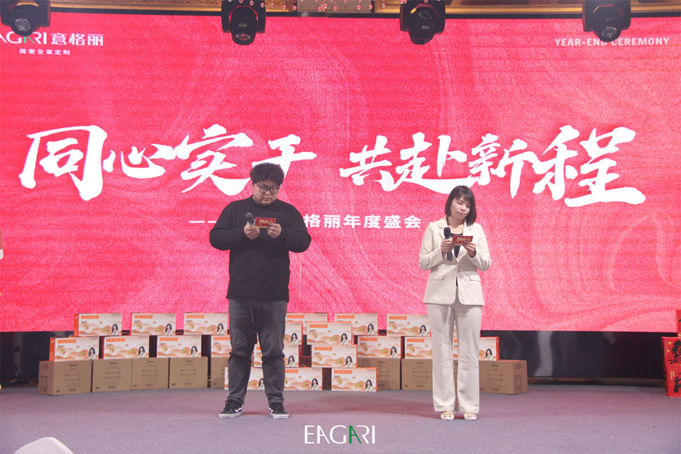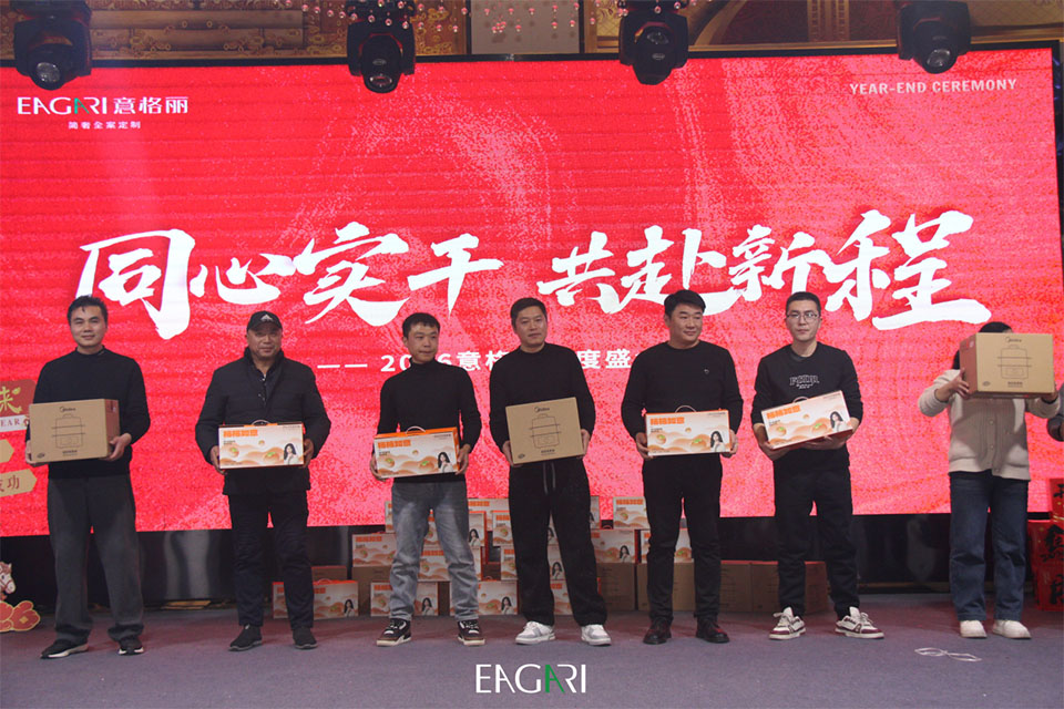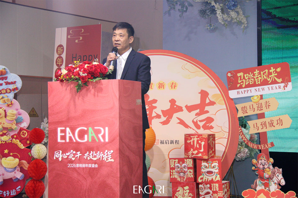 盛典之上,意格丽董事长梅建华先生登台致辞,为全体家人带来温暖与期许。梅董深情复盘了过去一年的亮眼成绩:从产品创新的突破到市场版图的拓展,从团队协作的精进至高定服务的升级,每一项成果的背后,都凝聚着意格丽家人的汗水与智慧,彰显着“同心实干”的企业精神。