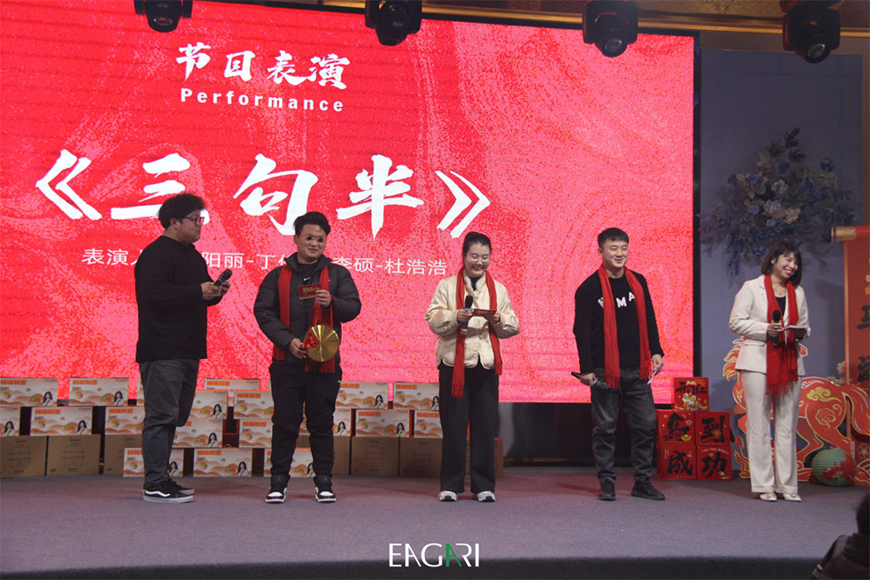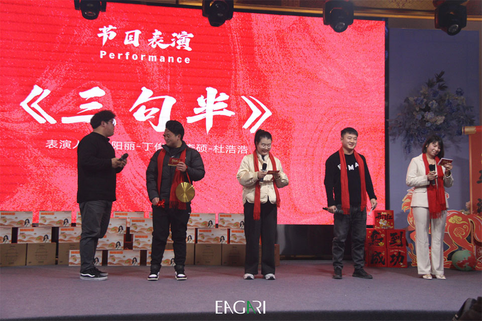 在热烈的掌声中,节目环节精彩登场。四位同事带来的三句半表演,以诙谐幽默的台词、生动活泼的演绎,为大家送上马年新春的美好祝福。“意格丽家人志气高,同心实干逞英豪,马年奔腾创佳绩——”“节节高!”“高定事业节节升,客户满意笑开颜,新年好运齐相聚——”“皆欢喜!”句句押韵的祝福既贴合马年新春氛围,又彰显了意格丽的企业风采,台下掌声、笑声此起彼伏,将现场气氛推向小高潮。
