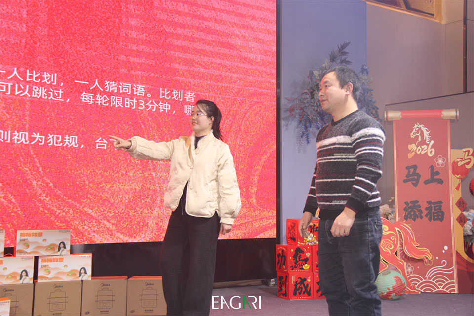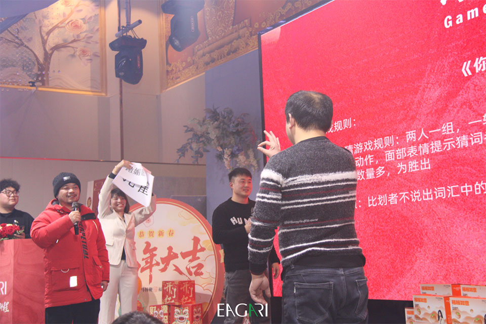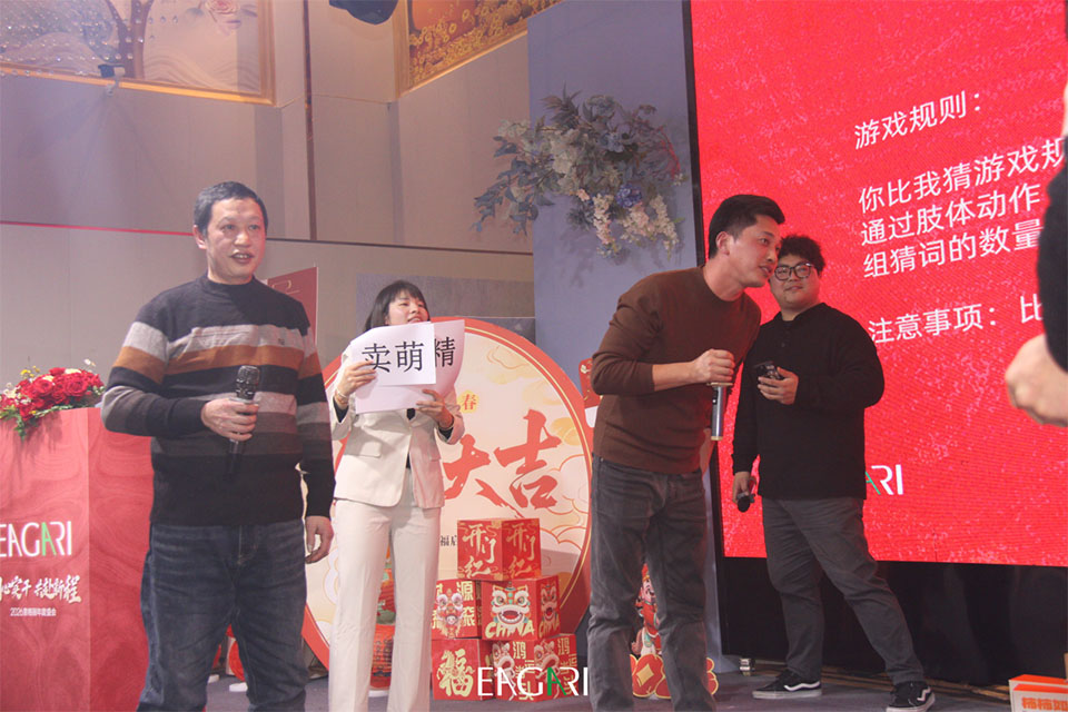激昂的朗诵过后,第二轮游戏“你划我猜”接力带来欢乐。这个考验同事间默契与脑洞的游戏,让现场氛围再度升温。表演者们手舞足蹈、妙趣横生,或用生动肢体语言传递信息,或用夸张表情辅助表达;猜题者们凝神倾听、灵机一动,从行业术语到生活热词,从品牌理念到产品特性,一个个难题在默契配合下迎刃而解。台下观众时而为精彩表现欢呼,时而为紧张时刻屏息,欢声笑语中进一步拉近了彼此的距离,展现了意格丽团队的协作魅力。