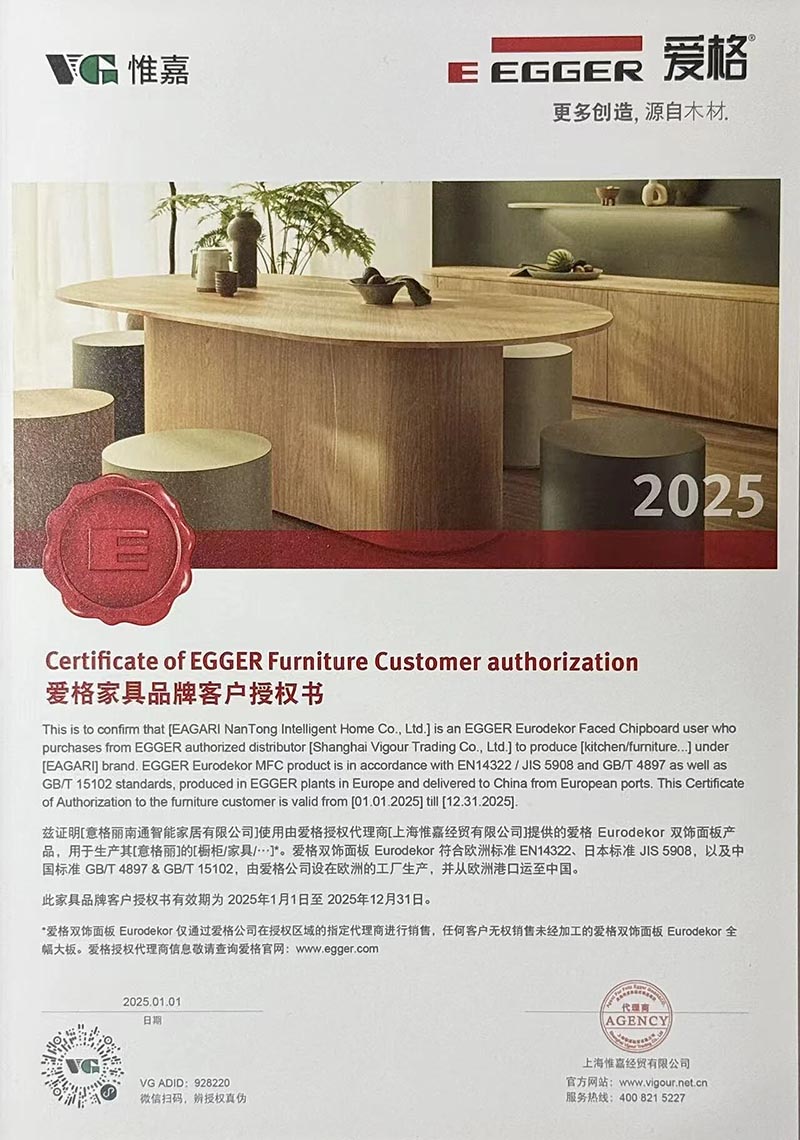 作为家居定制的核心,基材的真实性直接决定生活品质。意格丽凭借严苛的品质标准、专业的生产实力,成功获得爱格品牌官方授权证书—— 这不仅是爱格对我们的认可,更是意格丽为客户 “守住品质底线” 的承诺。每一块用于定制的爱格板材,都可追溯源头、核查真伪,让你在家就能享受与欧洲同步的环保、耐用与美学体验。