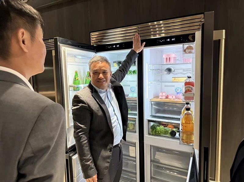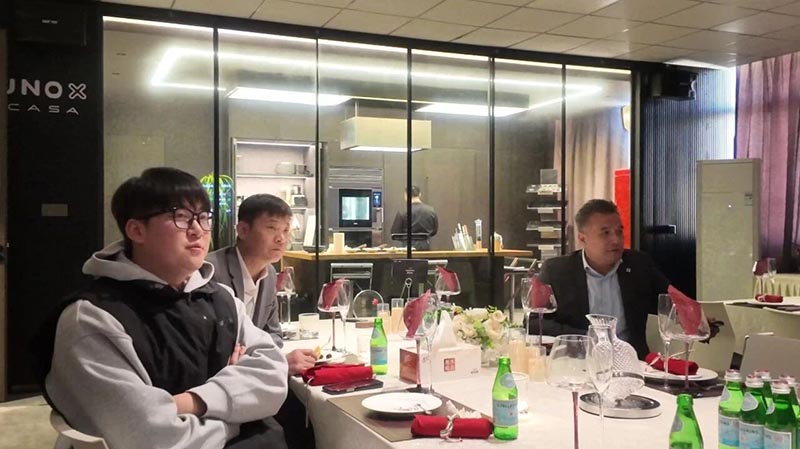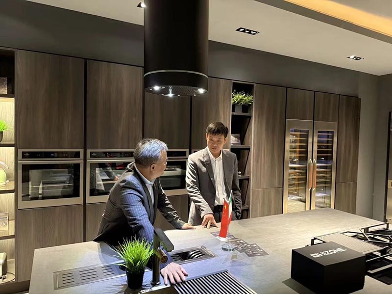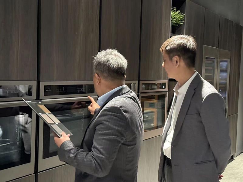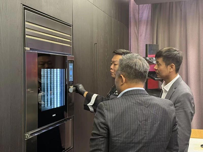 威莫高端电器展厅的每一处细节,都诠释着“科技服务生活”的理念。从嵌入式蒸烤箱的精准控温,到智能烟机的高效净吸,再到集成电器的空间美学设计,每一款产品都不是冰冷的工业造物,而是融入生活场景的实用艺术品。 交流中,双方就高端用户的生活需求展开热烈探讨。意格丽深耕全案定制多年,深知高定厨房不仅是烹饪空间,更是家庭情感交流的核心;而威莫对电器性能与设计美学的极致追求,恰好与意格丽“让理想生活落地”的理念不谋而合。从用户痛点出发,从场景需求切入,相同的价值导向让这场交流成为一次思想的同频共振。