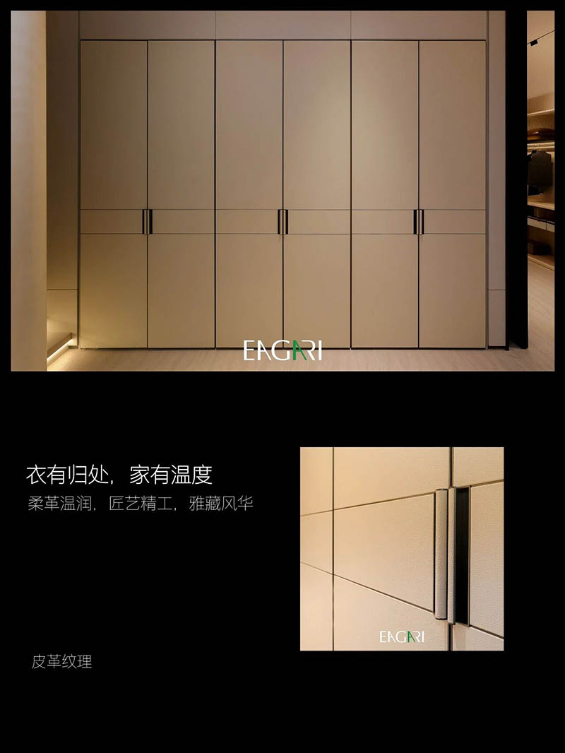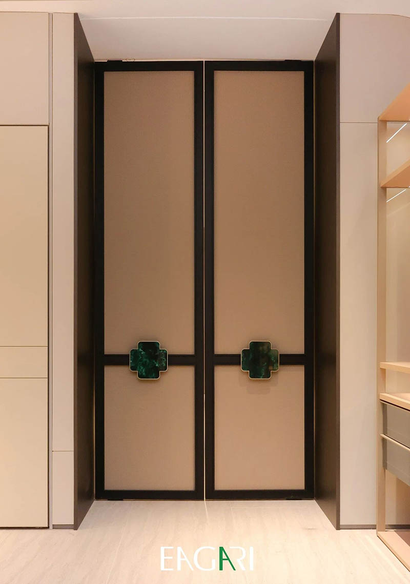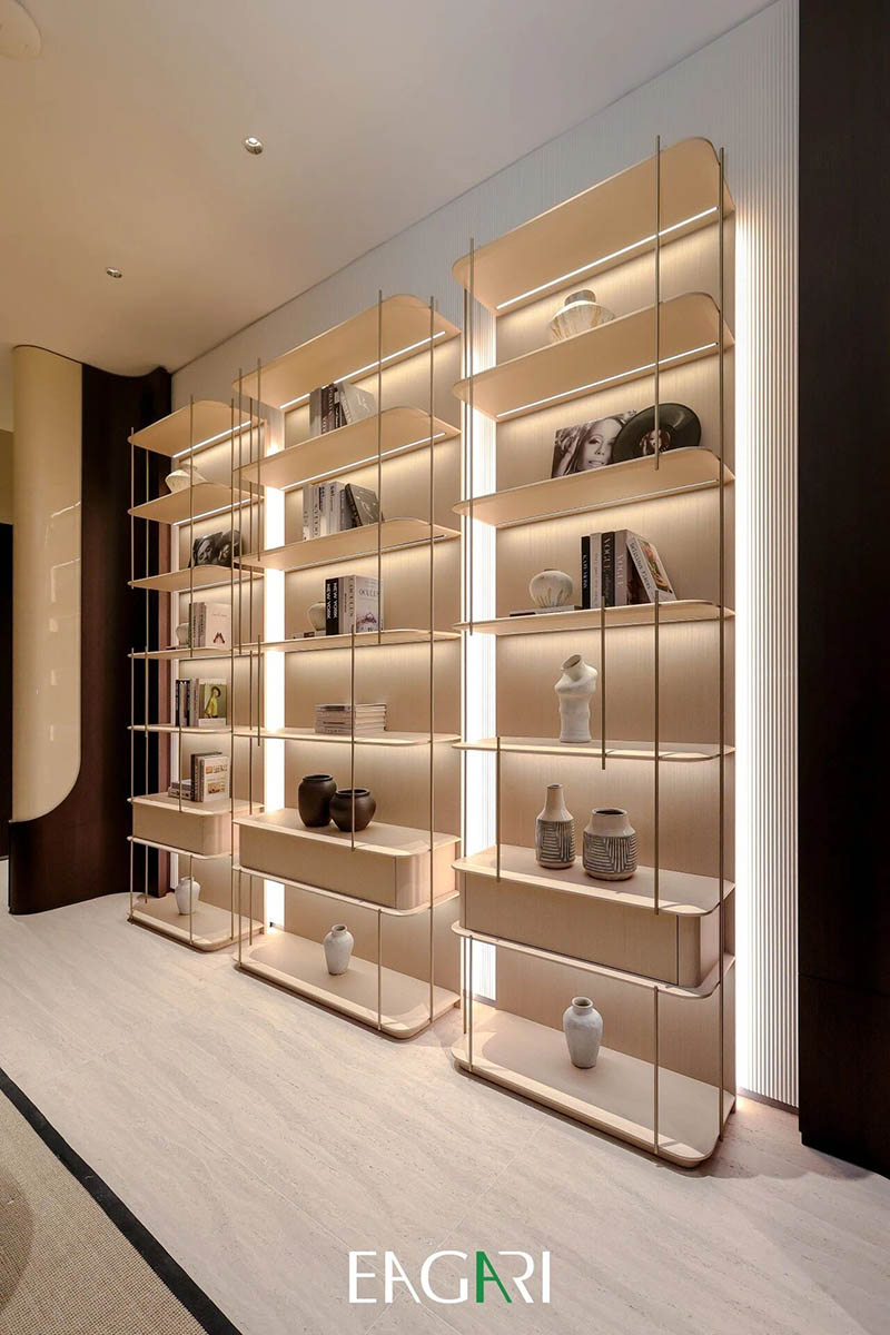 光为灵感,屿为归处。 这间书房取宋画开卷之意,将东方书卷气揉入现代方寸。弧形墙如宣纸徐徐舒展,影木与烟熏橡木围合出温润意境,波浪格栅间光影流转,恰似笔墨留白,气韵悠然。 左门承古籍压纹,触手如抚旧卷;右壁雕水墨清荷,清雅含蓄。地面洞石如淡墨晕染,步入此间,恰似展卷入画,于尘世喧嚣中,独得一方宁静的精神归隅。